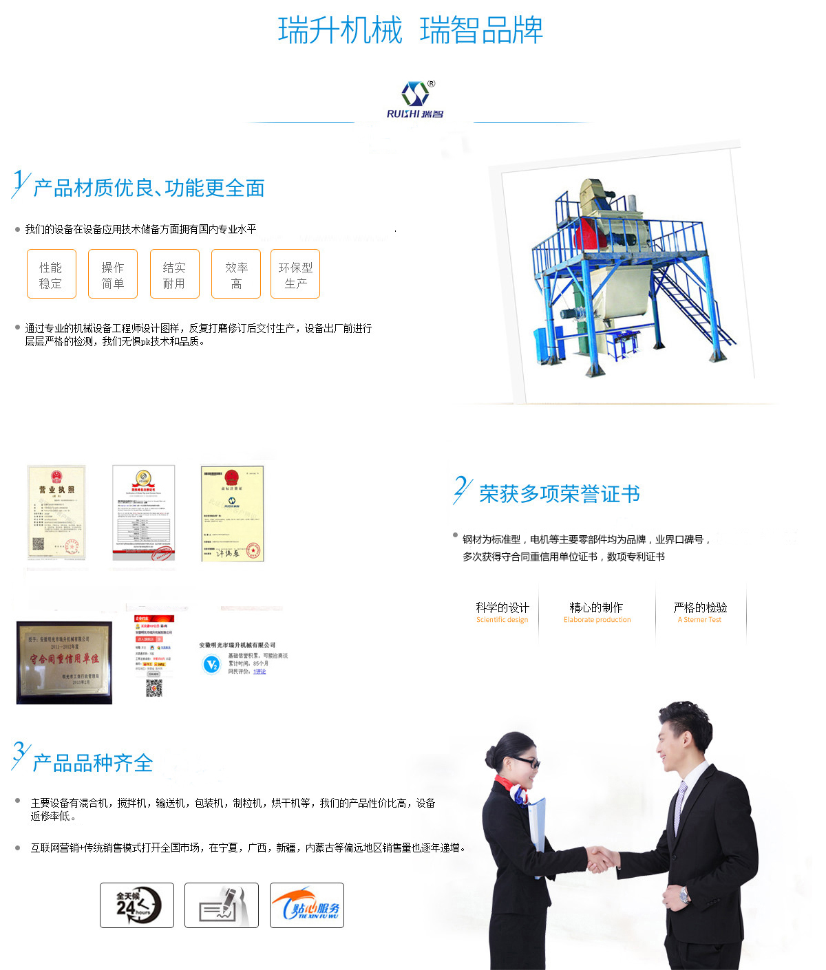 安徽瑞升機(jī)械制造有限公司坐落在明光市工業(yè)園區(qū),本公司產(chǎn)品主要用于粉料物質(zhì),顆粒物質(zhì)的混合、攪拌、輸送、包裝的自動(dòng)化生產(chǎn)設(shè)備。工廠占地面積為1萬多平方現(xiàn)有6000平方米的生產(chǎn)車間和各類加工檢測設(shè)備,具備產(chǎn)品開發(fā)、研制、設(shè)計(jì)、生產(chǎn)、試驗(yàn)、倉儲(chǔ)運(yùn)輸?shù)饶芰Γ梢陨a(chǎn)多種規(guī)格、多種非標(biāo)定制的產(chǎn)品,并有多項(xiàng)技術(shù)獲得國家專利,擁有自主進(jìn)出口權(quán),公司憑借優(yōu)良的技術(shù)、先進(jìn)的工藝和科學(xué)的管理理念,所生產(chǎn)的產(chǎn)品已暢銷全國各地,部分產(chǎn)品已進(jìn)入馬耳他、印度尼西亞、韓國、羅馬尼亞、沙特阿拉伯、馬來西亞、印度、巴基斯坦、等國家和地區(qū),受到國內(nèi)外客戶的高度認(rèn)可和信賴。 本公司獲得守合同重信用單位證書,對原材料的采購極為細(xì)致,鋼材為標(biāo)準(zhǔn)型,電機(jī)等主要零部件均為品牌,數(shù)項(xiàng)專利證書。技術(shù)方面我司擁有一支國內(nèi)的技術(shù)和管理團(tuán)隊(duì),在機(jī)械設(shè)備應(yīng)用...公司資質(zhì)榮譽(yù)